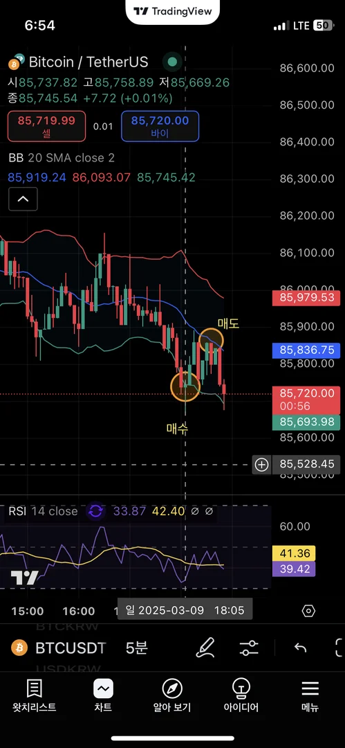 차트가 볼린저 밴드 하단 지지 구간에 도달했을 때 rsi 지수는 33.87로 과매도 상태인 것을 확인해 매매를 진행했습니다.