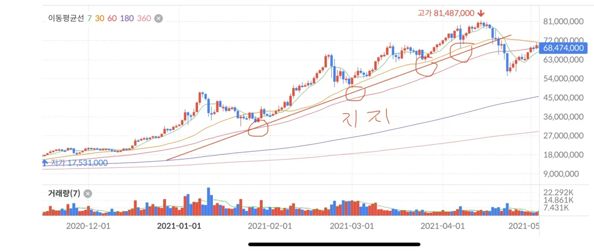 이 사진은 지지선을 작도하였고 상승 추세를 보여주고 있습니다.