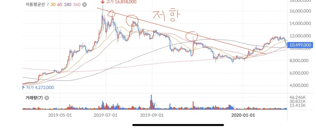 이 사진은 저항선을 작도하였고 하락 추세를 보여주고 있습니다.
