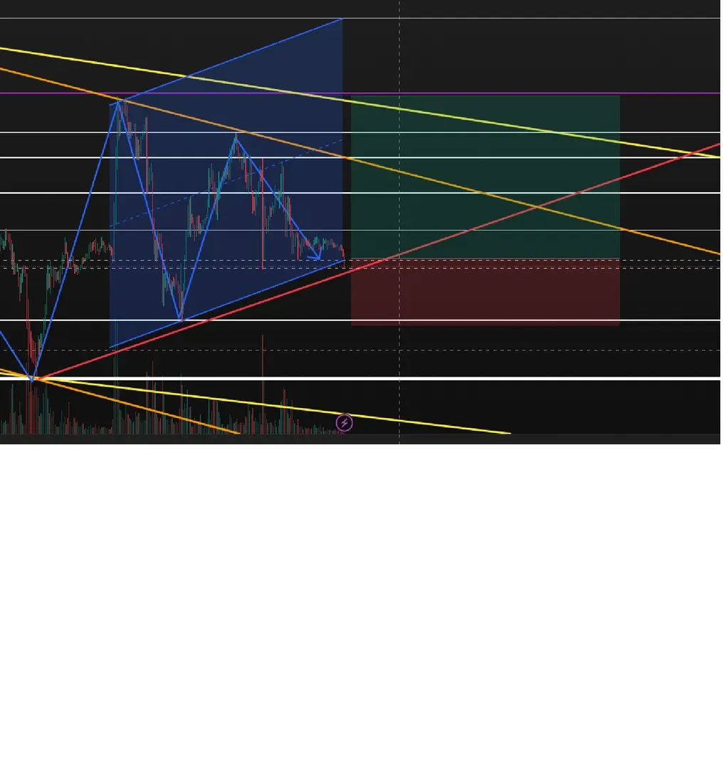 라이징 웻지 모형을 이룸. 저항선에서 거래량이 터진 것으로 보아, 강한 저항선이 될 예정. 긴 하락 이후 반등으로 상승장 예상. RSI에서 상승 다이버전스가 관찰되지는 않으나, 하락 다이버전스가 관찰되지도 않음. 피보나치 되돌림 0.786을 찍고 0.382에서 조정. 0.236 전에 큰