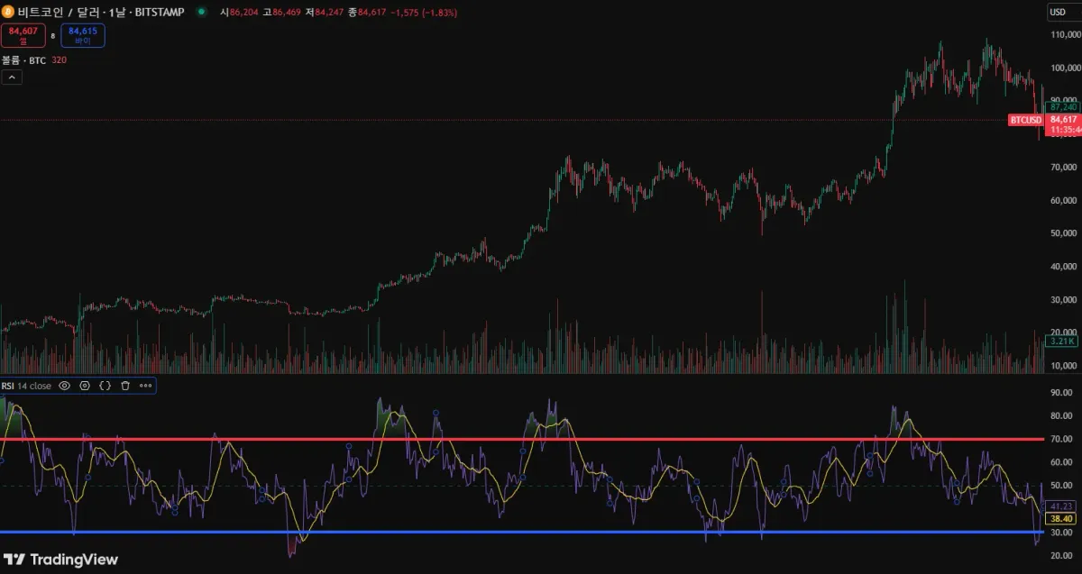시세는 상승 추세이나 rsi 지표 하락시 하락 다이버전스,