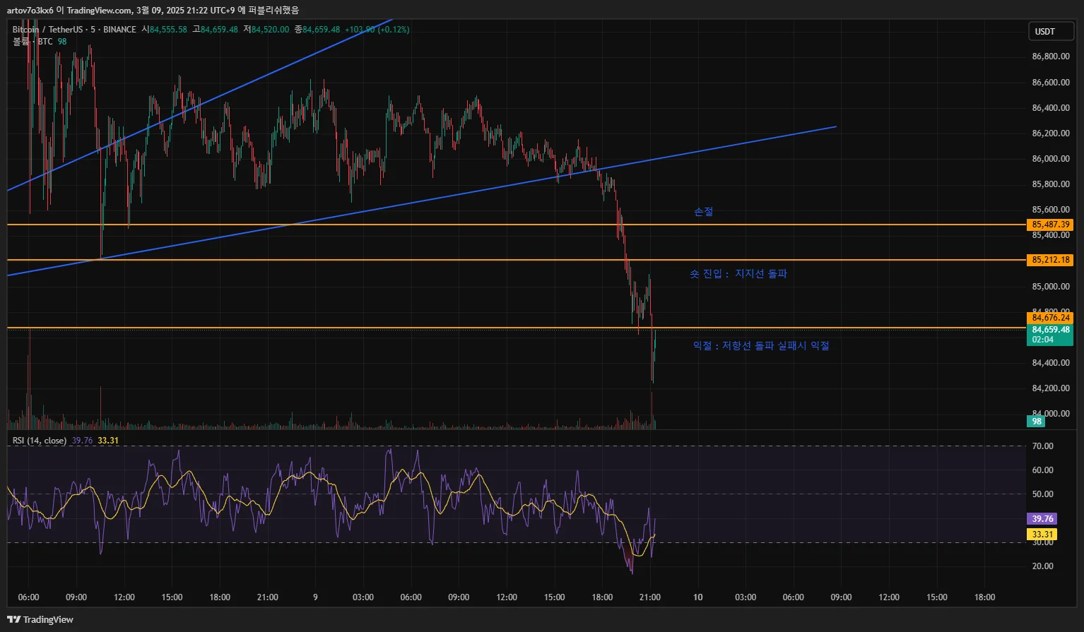 일단 지지선 돌파 하락을 근거로 숏 포지션 진입했습니다. (모의투자)