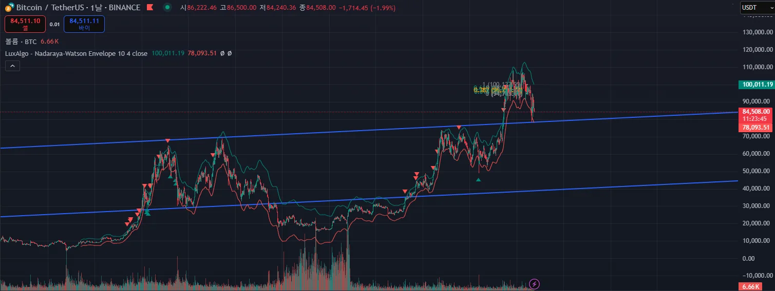 비트코인 과거 저점과 코로나 전 불장 당시의 고점으로 채널을 만들고, 최근 대폭락에서 리테스팅을 한 것을 알 수 있었습니다.
