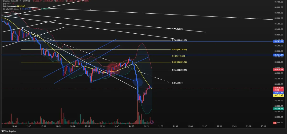 의문점: 21:00시경 저렇게 떨어지는것을 예측할수 있었던것은 볼린져 밴드 뿐인지 궁금합니다.