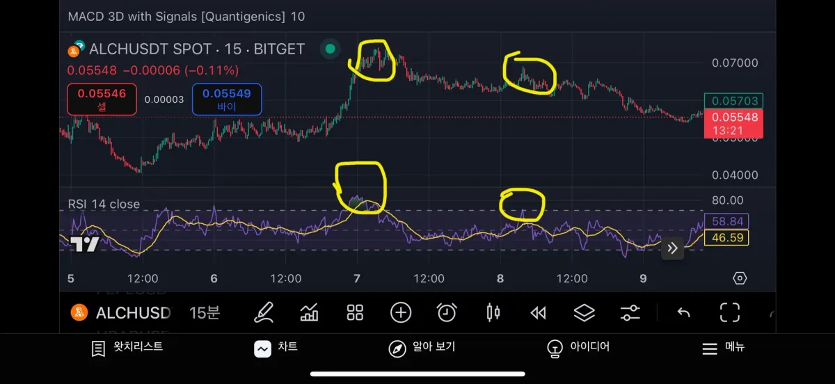 강의 후 rsi지표를 추가해서 70이상 과매수 구간해서 하락하는 모습을 볼수있었습니다!