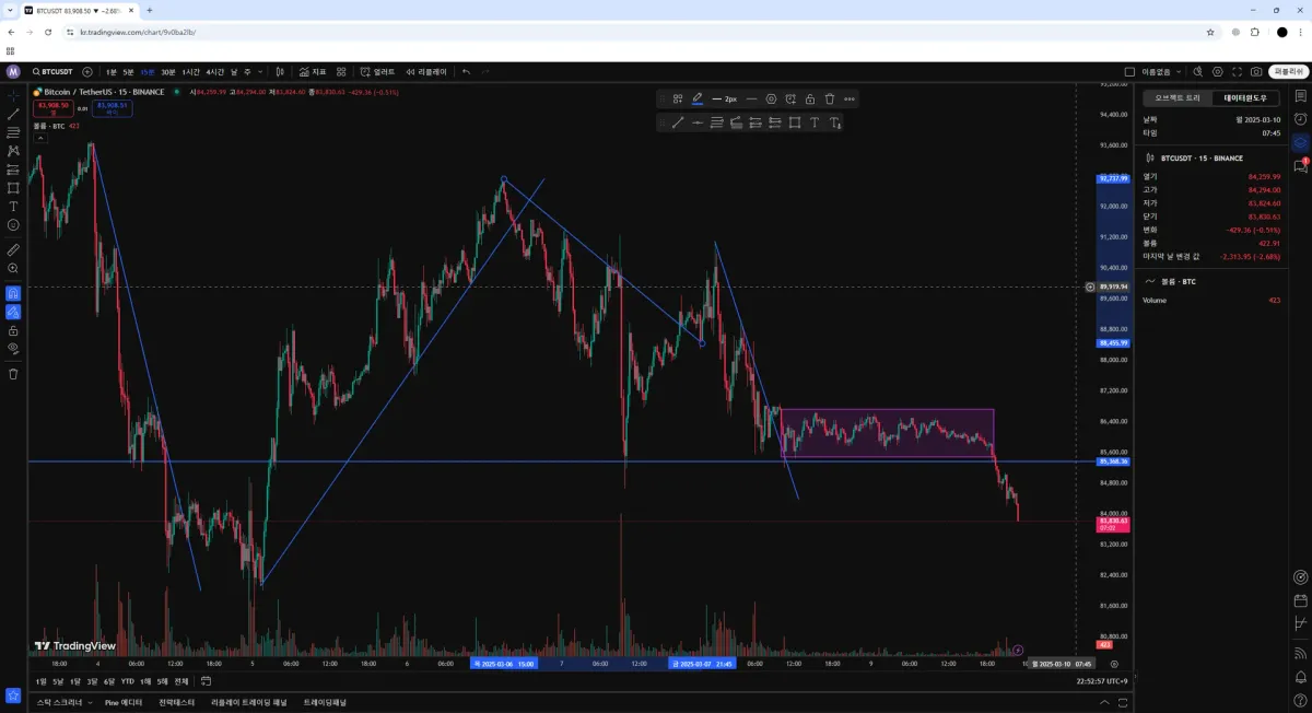 상승추세선, 하락추세선, 지지선이자 저항선, 횡보 구간 그려봤습니다