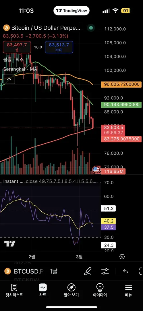 Ris 70이상 과매수도 아닌 30이하 과매도 현상도 아닌 그 중간에 위치한 것 같습니다. 이동평균곡선을 적용했을때 하락 크로스 인것 같아서 가격이 더 떨어질 것 같습니다.