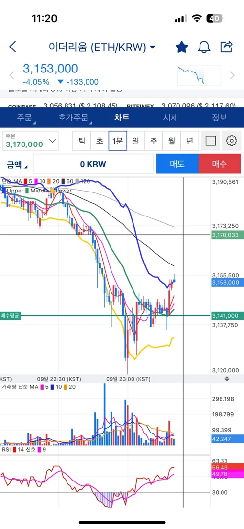 볼린저 바닥치고 올라오고 있었고 여기가 전저점 지지점으로 판단되어 매수에 들어갔습니다. 현재 하락추세인만큼 3170000원선을 저항선으로 보아 하락할 것으로 예상해봤습니다. 여기서 매도 잡을 생각입니다. 쫄보라 만원씩 연습하고 있습니다!!