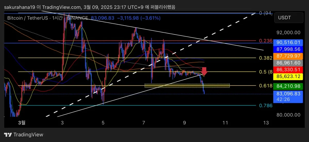 피보나치와 앞저점 지지선이 무너져 숏 포지션 으로 진입해보았습니다