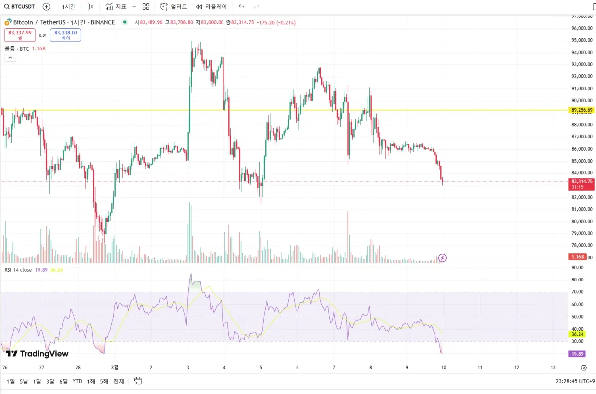 RSI 지표 추가해서 1간봉 보고 있습니다. 현재 과매도 상태로 보입니다.