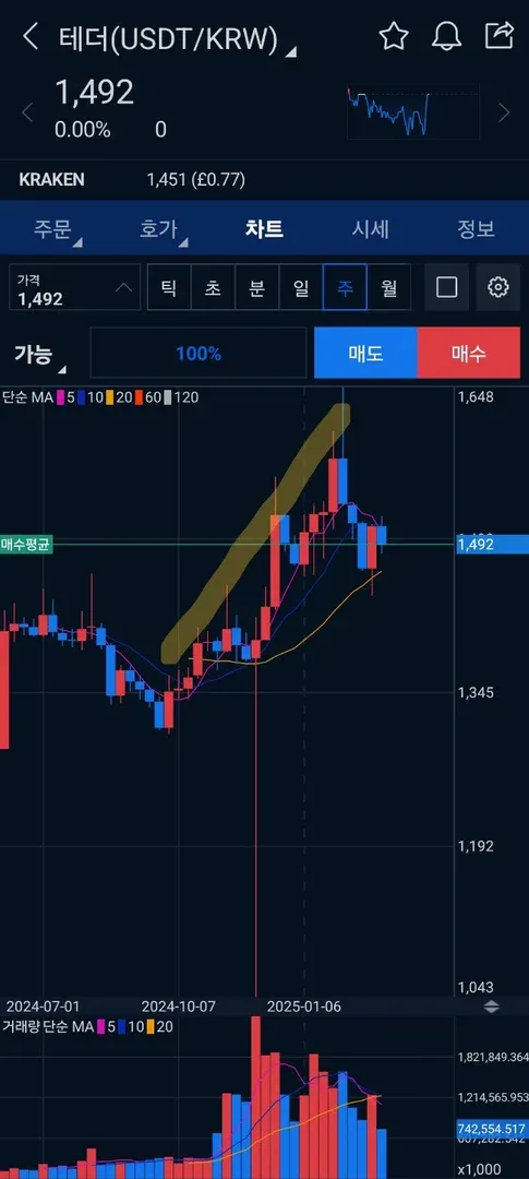 상승 추세선을 그리고 있어 매수했고, 하락 추세석을 타기 시작하면 매도할 예정입니다.