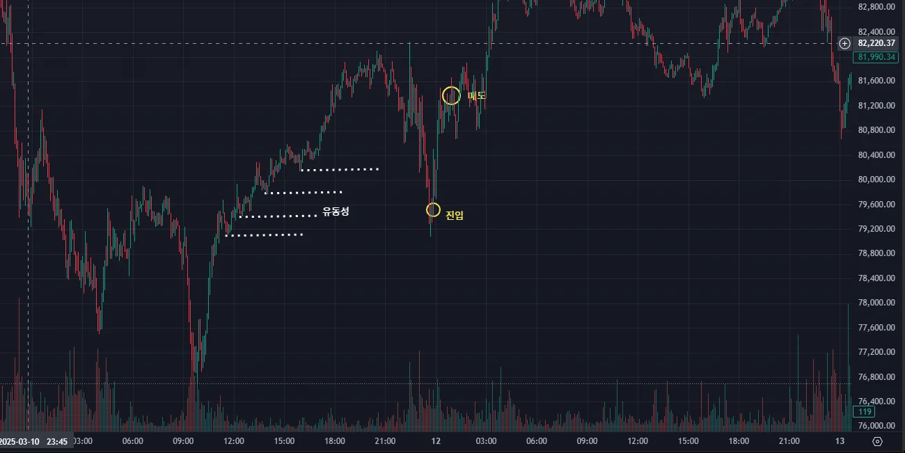 진입시점은 망치형 캔들이 보이고 바로 진입 손절선은 바로 직전 저점으로 짧게 잡고 들어감