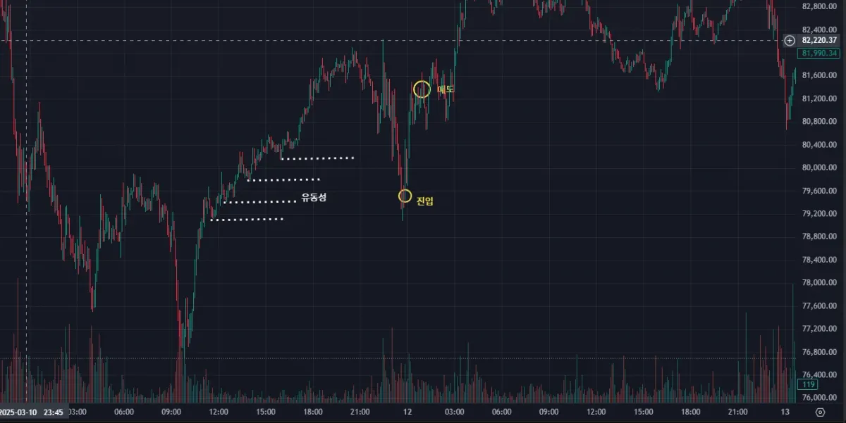 - 진입 이유 : 엄청나게 하락을 하고 다시 되돌림을 주면서 상승하던 움직임에서 급락하는 움직임이 나올 때 전체적인 상방추세가 무너지지 않고 유동성 흡수 움직임이라 판단.