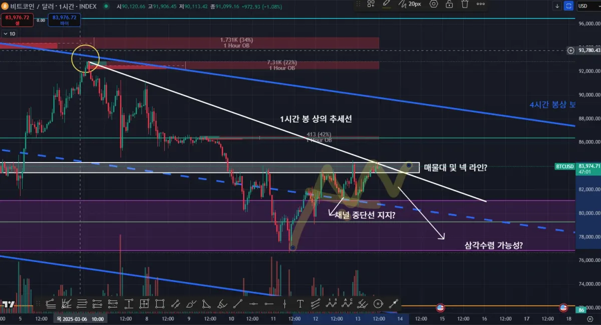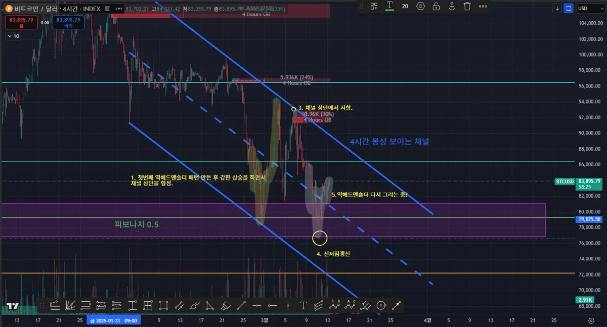 4시간 봉 상의 관점 : 하락 채널 안에서 반등 시도 중으로 보임.