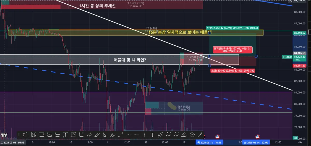 15분 봉상 현재 추세선을 돌파할 때 롱 포지션을 잡으면 대략 1:2.5 근방의 손익비 자리가 있어 보임.
