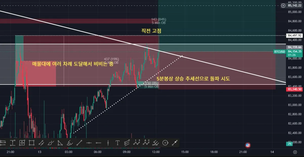 5분봉 상 매물대 비비고 상승 추세 유지 중.