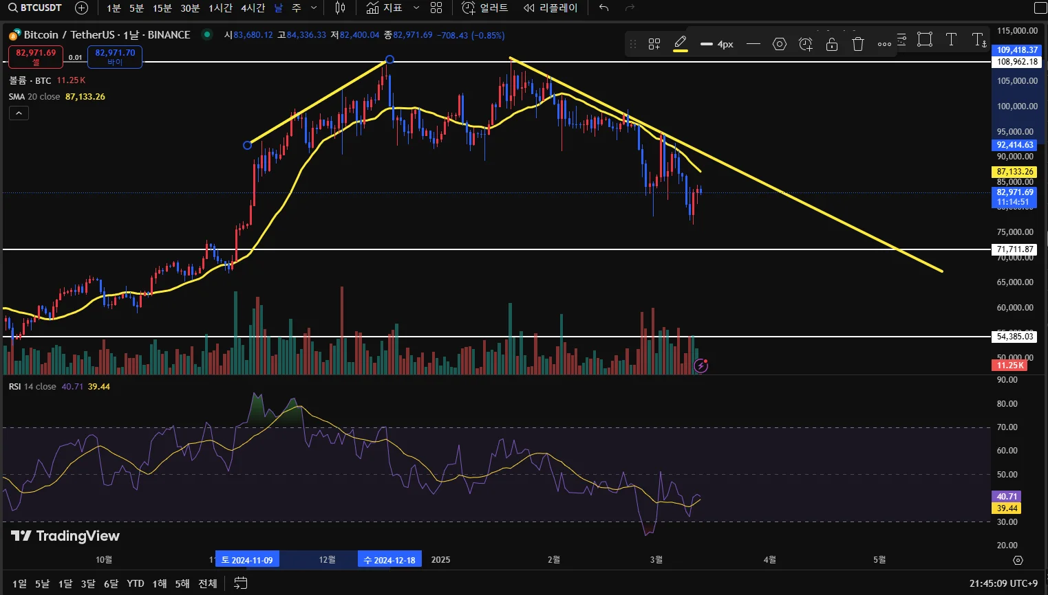 만약 지지선 아래로 내려간다고 하면 큰 하락이 있을거 같고 오른쪽 추세선을 뚫는다면 상승을 할것으로 생각합니다.