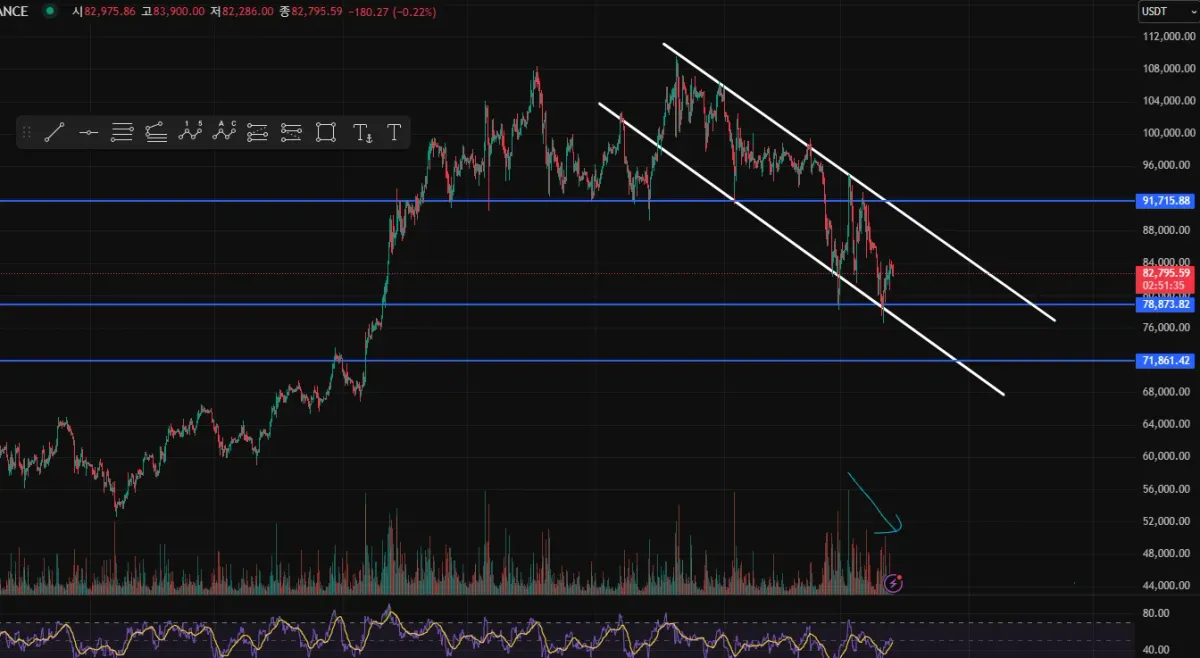 지지선과 저항선 그리고 추세선 그려보았습니다. 현재 고점 찍고 하락 추세에 있는 것으로 생각되며 78800이 뚫릴 시 다음 지지선은 72000불 정도 될 것 같습니다.