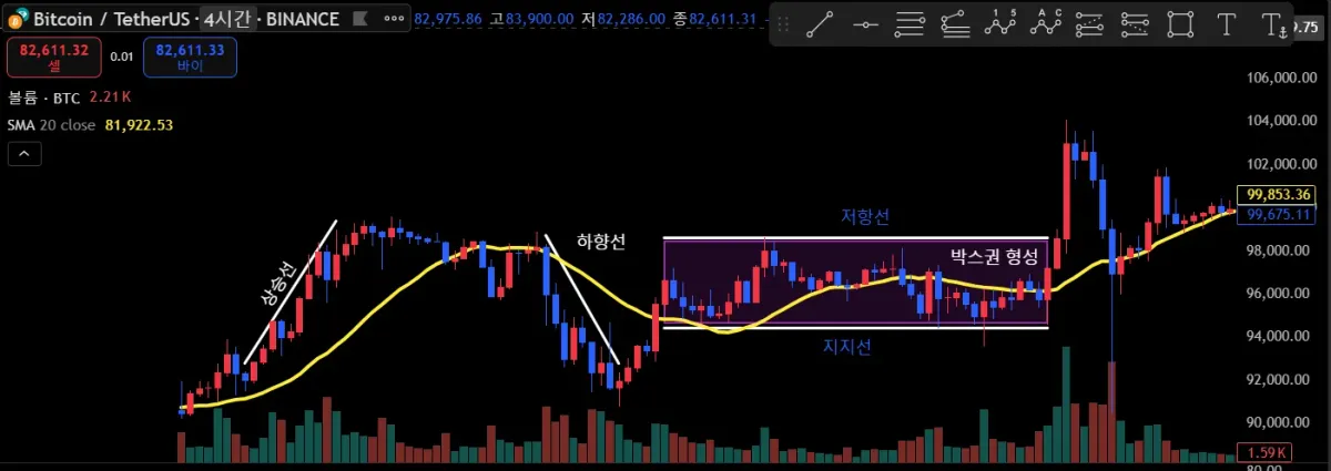상승과 하락을 진행한 후 박스권에 진입하여 다시 저항선을 뚫고 올라갑니다.