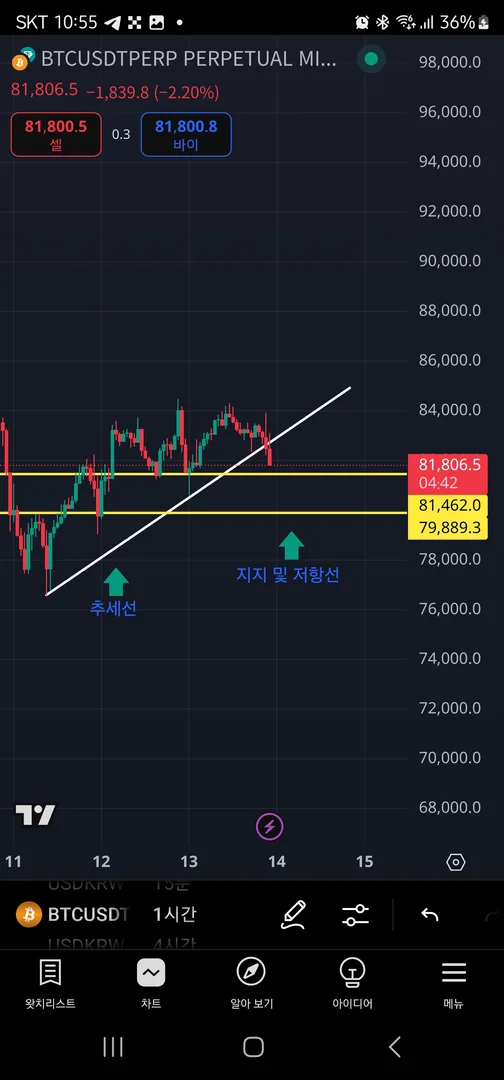 상승추세선을 하락돌파해서 하락중이며 1차 지지라인 돌파시 2차 지지라인까지 떨어질 수 있다고 봅니다.
