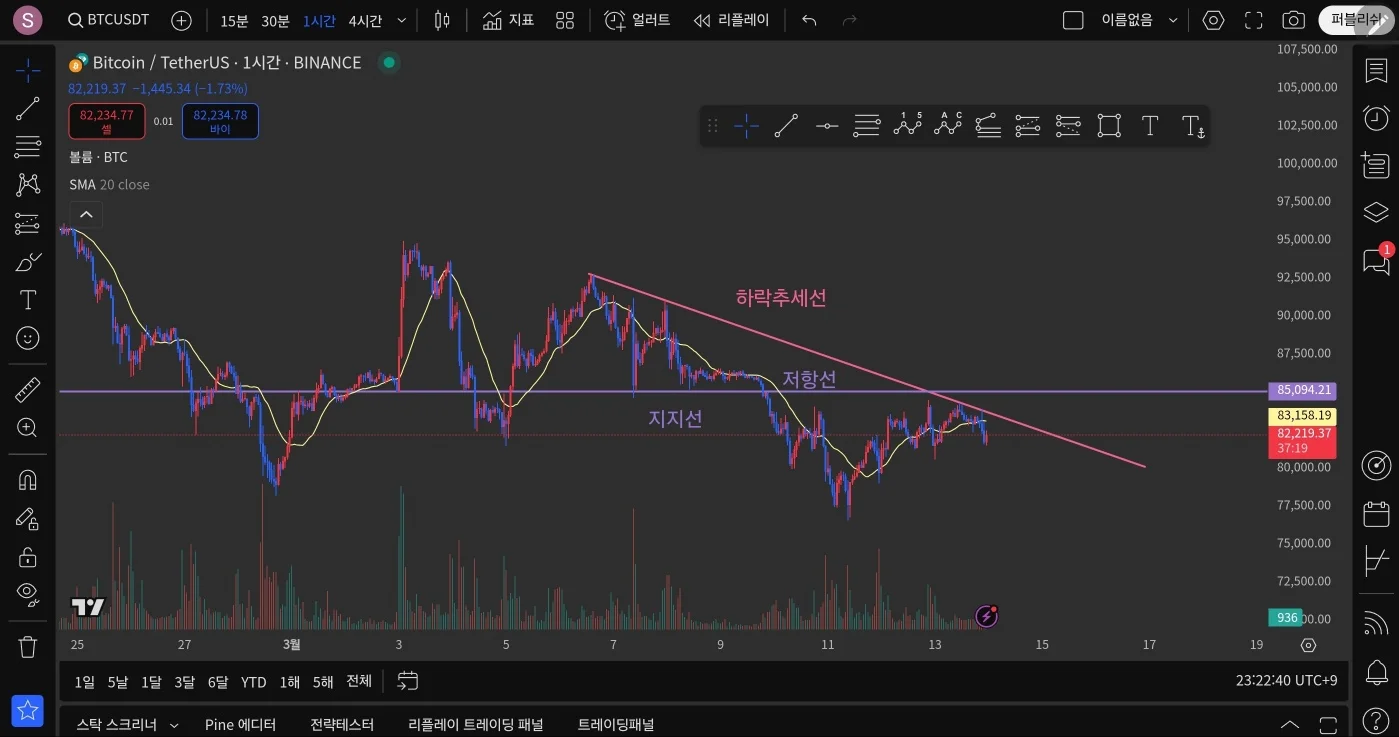 지금 저의 생각으로는 저 하락 추세선을 넘을 때 저항선까지의 상승을 바랄 수 있다고 봐집니다....!