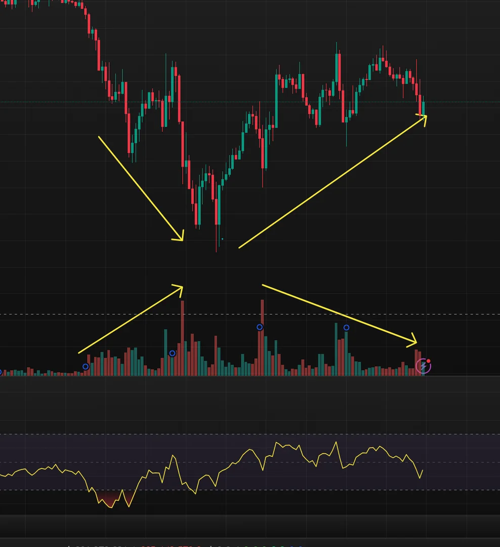 -. RSI 차트를 추가해봤고 이전 강의에서 들었던 거래량과 더불어 분석을 해보았습니다