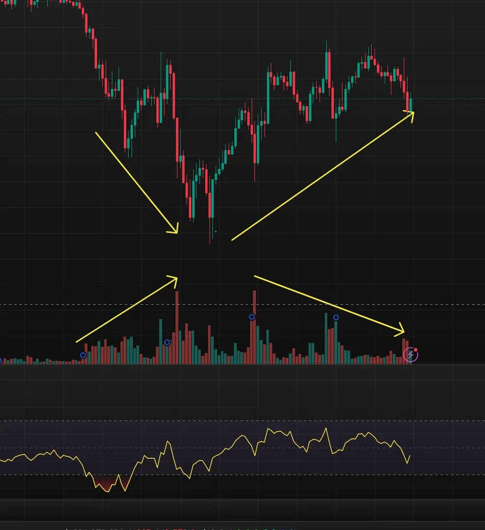 일시적으로 차트는 하락하지만 거래량은 상승하면서 rsi 지표는 상승다이버전스고있네요 -> 차트자체는 아락하면서 거래량은상승? ->위험 신호