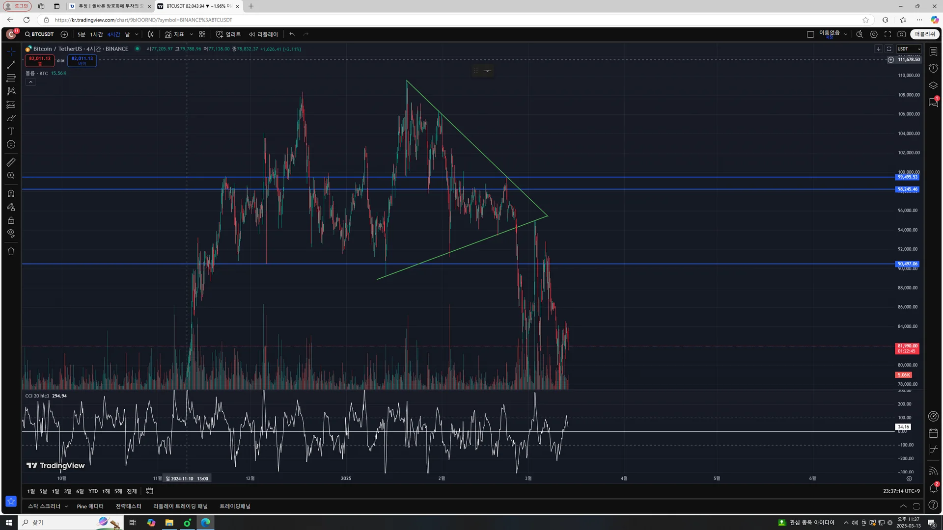 지지선과 저항선을 그었고 추세선 또한 초록색으로 그었습니다 밑에 초록색 선을 확인 해보면 지지를 받다가 지지이탈후 이 선이 저항이 되는것을 확인하였습니다