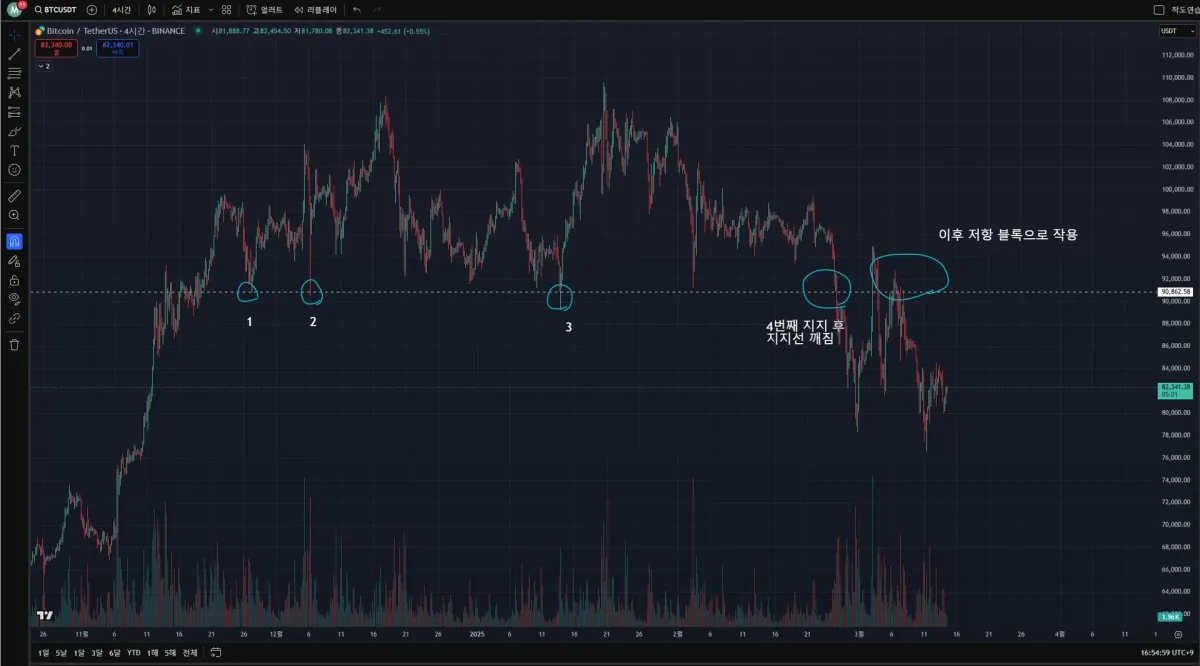 - 비트코인 4시간봉 최신 차트에서 수평선 작도했습니다. 4번 지지 후에 지지선이 깨지니 급락이 발생합니다. 이후 반등을 하여 수평선 부근에 올라왔지만 정확히 선에서 저항을 받은건 아니지만 수평선 부근 박스에서 저항을 받고 다시 떨어지고 있습니다.