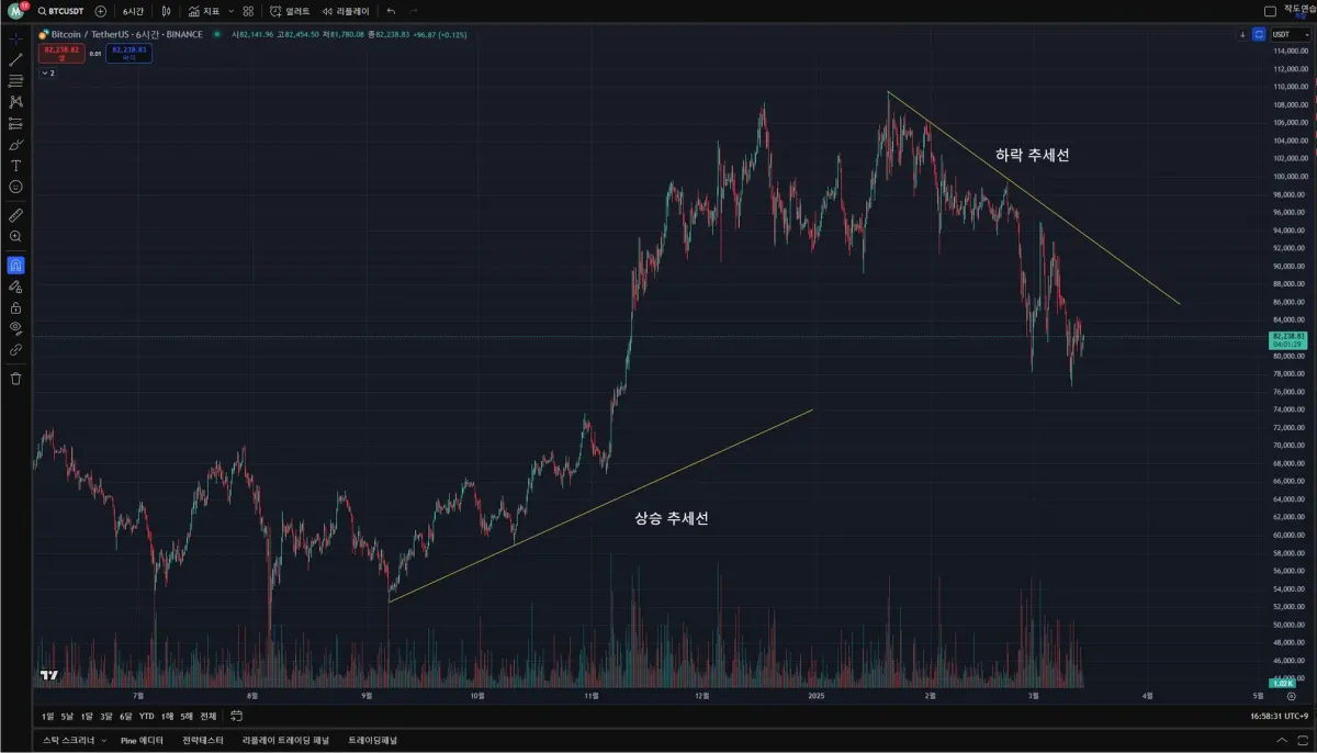 - 비트코인 4시간봉 최신 차트에서 상승 추세선과 하락 추세선을 작도했습니다. 아래 박스권 형성 후 저점을 높이는 저점 두개를 이어서 작도를 했는데, 그 뒤로 추세선에 닿은적은 없습니다. 다음으로는 최근 조정중인 상태에서 고점을 낮추는 하락 추세선을 작도했습니다. 총 3~4번 정도 추세선 부근에서 다시 하락하는 추세 입니다.