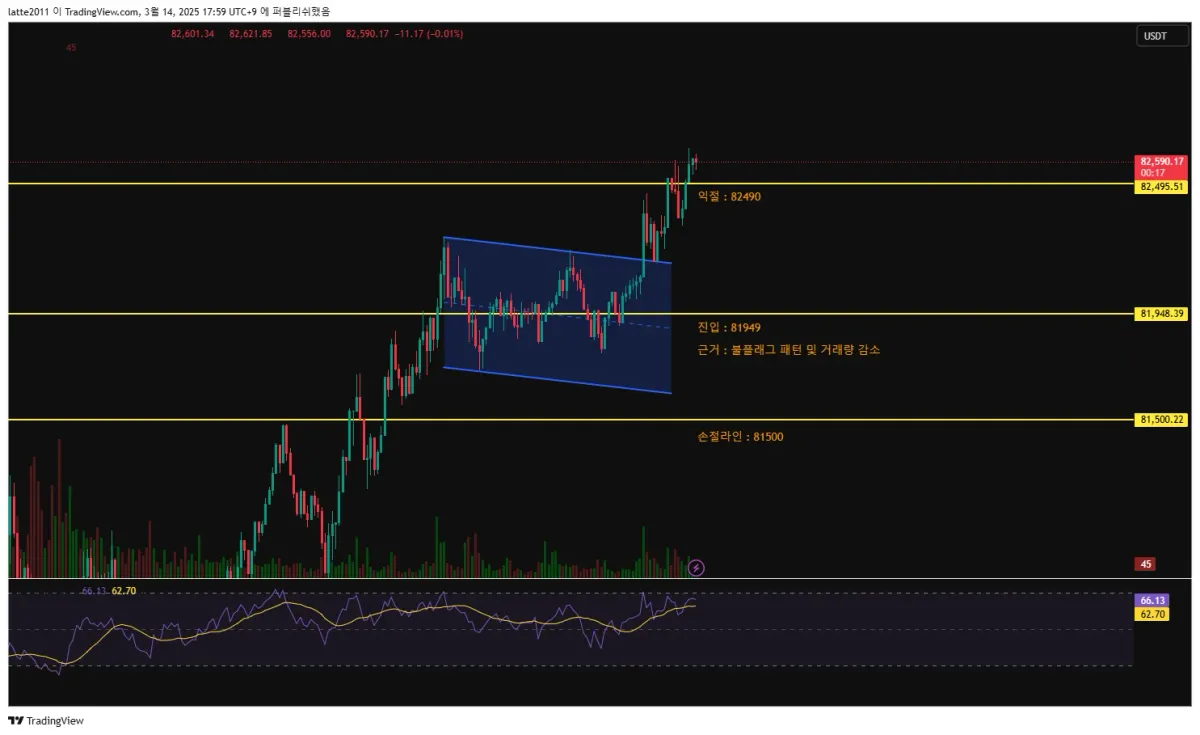볼플래그패턴이라고 판단하였고, 거래량도 함께 감소하여 진입하였습니다.
