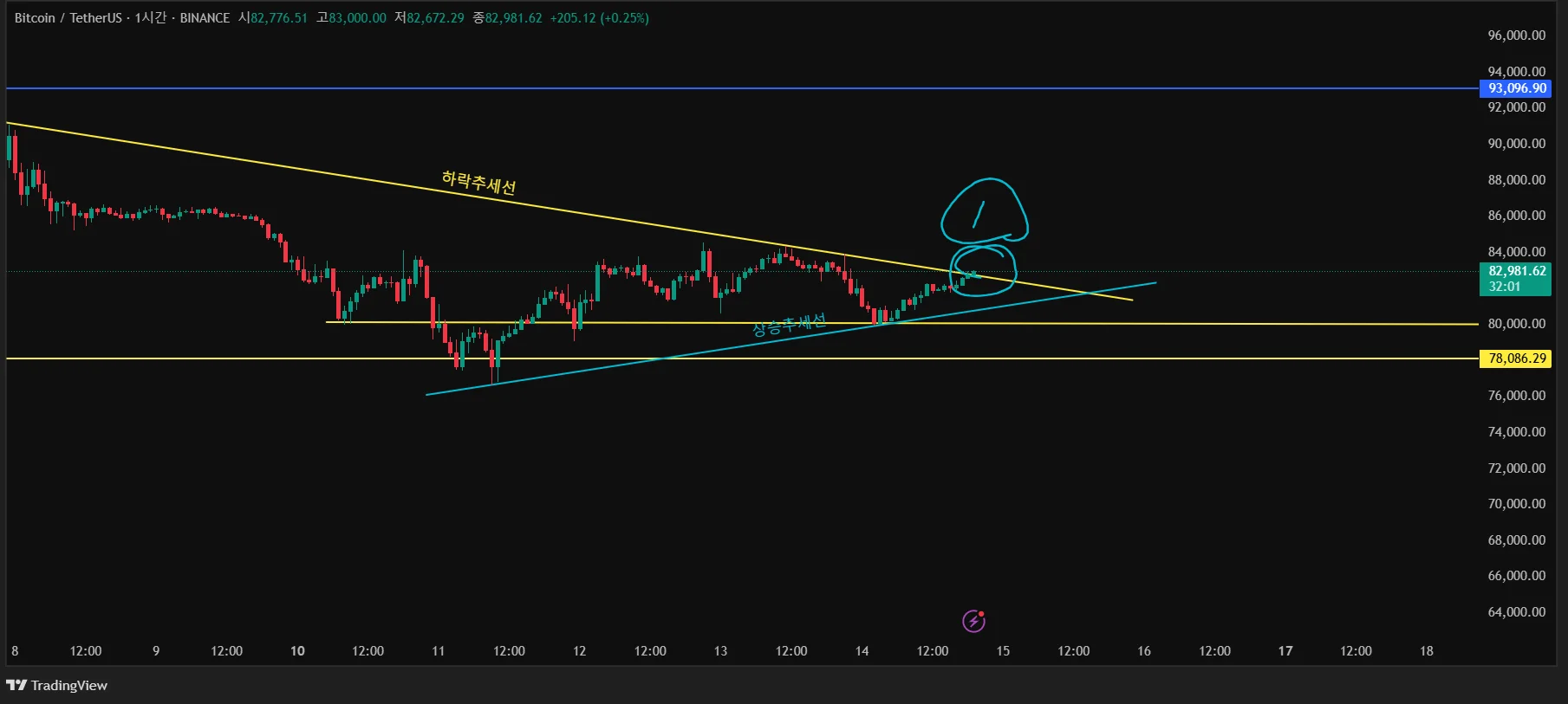 장기적인 하락 추세선과 단기적인 상승추세선을 작도했습니다.