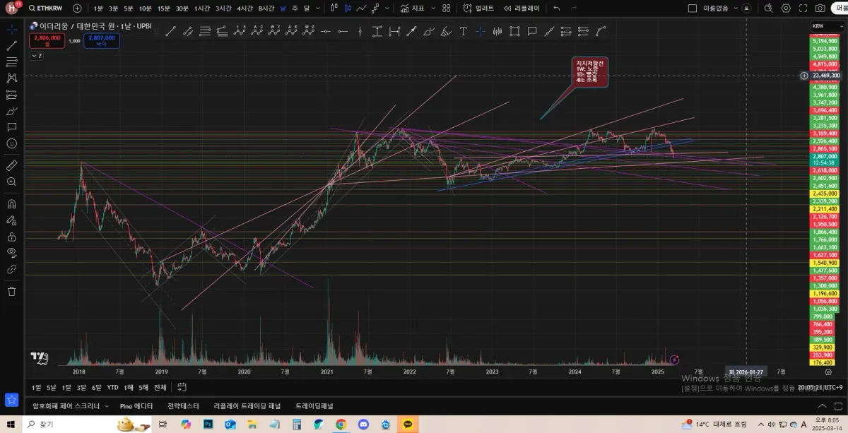 거래량 터진 캔들 위주로 추세선도 그려 봤습니다.