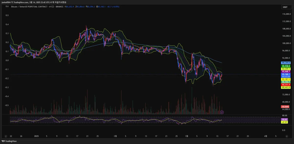 rsi ,거래량 , 그리고 볼린저 밴드를 추가하여 차트를 물흐르듯 과거 차트를 보고 있습니다 .