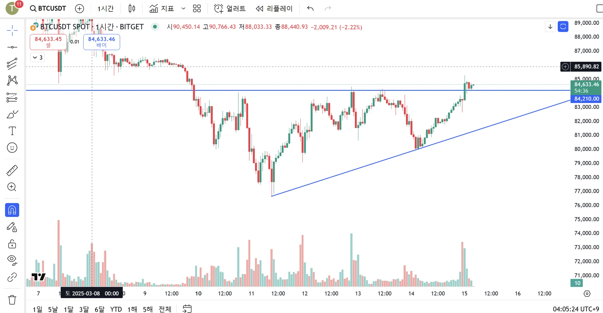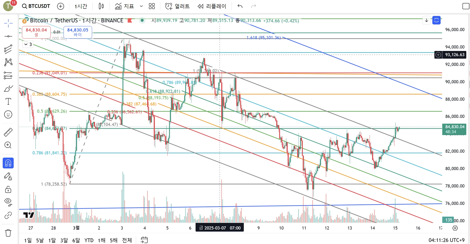 안녕하세요! 저는 현재 1시간봉 비트코인 차트를 가지고 왔는데 76k를 저점으로 상승 추세선을 확인할 수 있고 84.2k 구간에서 계속 저항 맞다가 오늘 뚫으면서 현재까지는 지지구간으로 바뀐 것을 확인할 수 있습니다. 앞으로 저 지지구간이 계속 유의미한지는 지켜봐야할 것 같아요! 아래는 좀 지저분하지만 피보나치 넣어봤습니다.