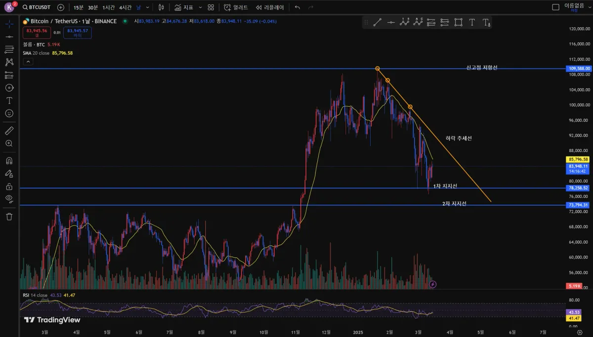 이후 하락추세선에 근접하지 못하고 더욱 급격하게 하락하는 모습입니다