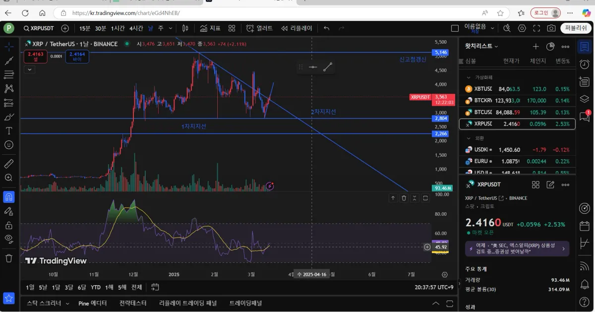 지지선 아래로 내려가지 않고 버티다가 다시 상승하는 모습입니다.