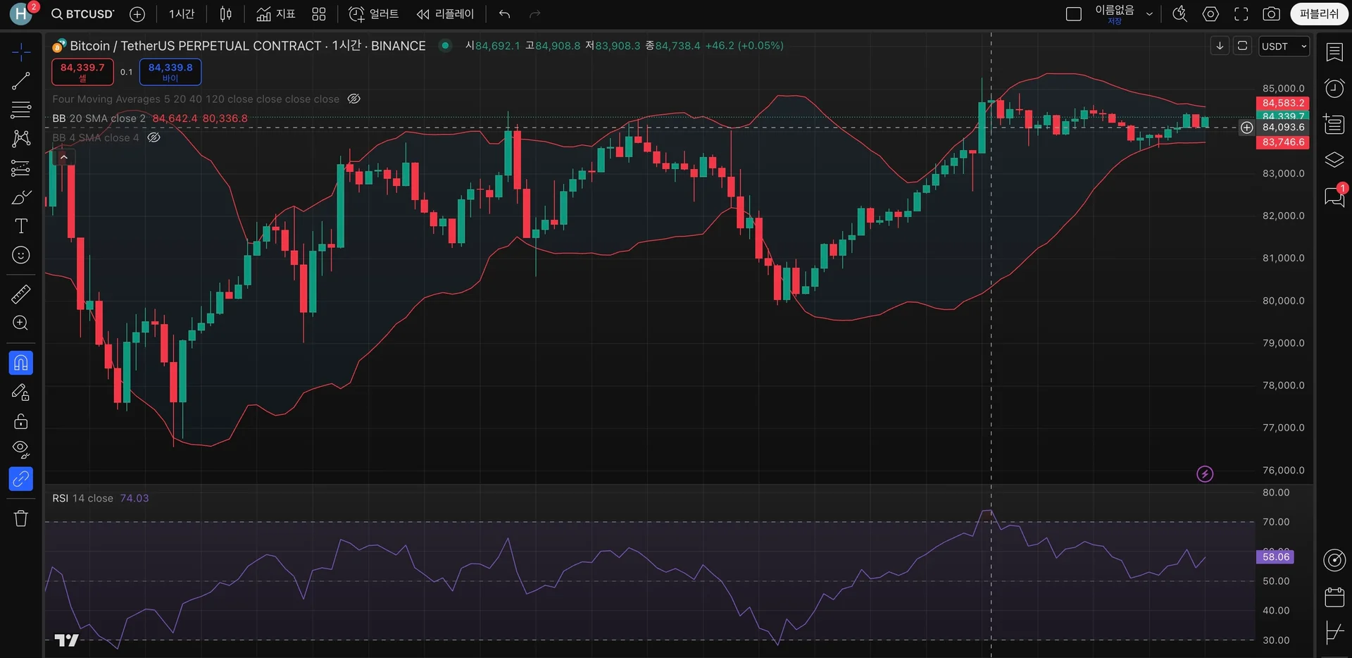 RSI 보조지표와 볼린져 밴드 추가 하였습니다.