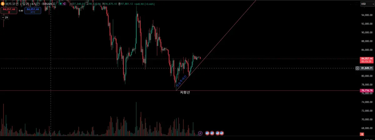 추세선과 저항선을 하나 씩 그려봤습니다. 다른 저항선과 추세는 현재 보이지 않아서 각각 1개씩만 그려보았습니다.