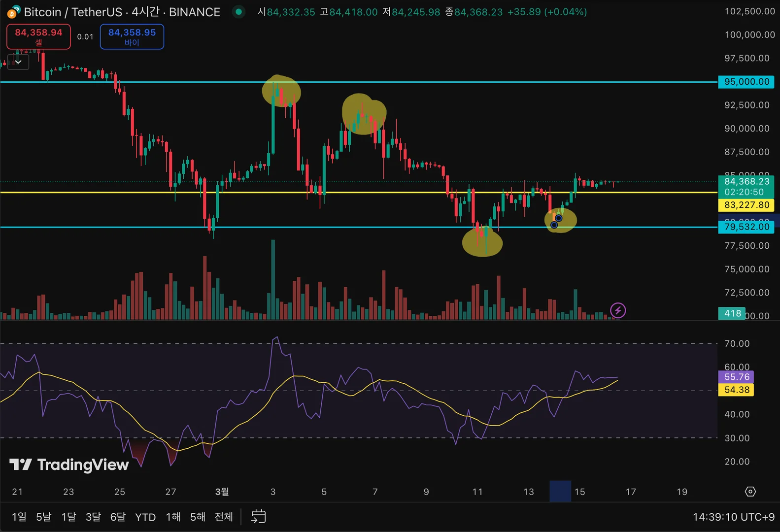 노란색 선은 노란색 하이라이트로 표시한 더블탑과 더블 바텀의 넥라인입니다.