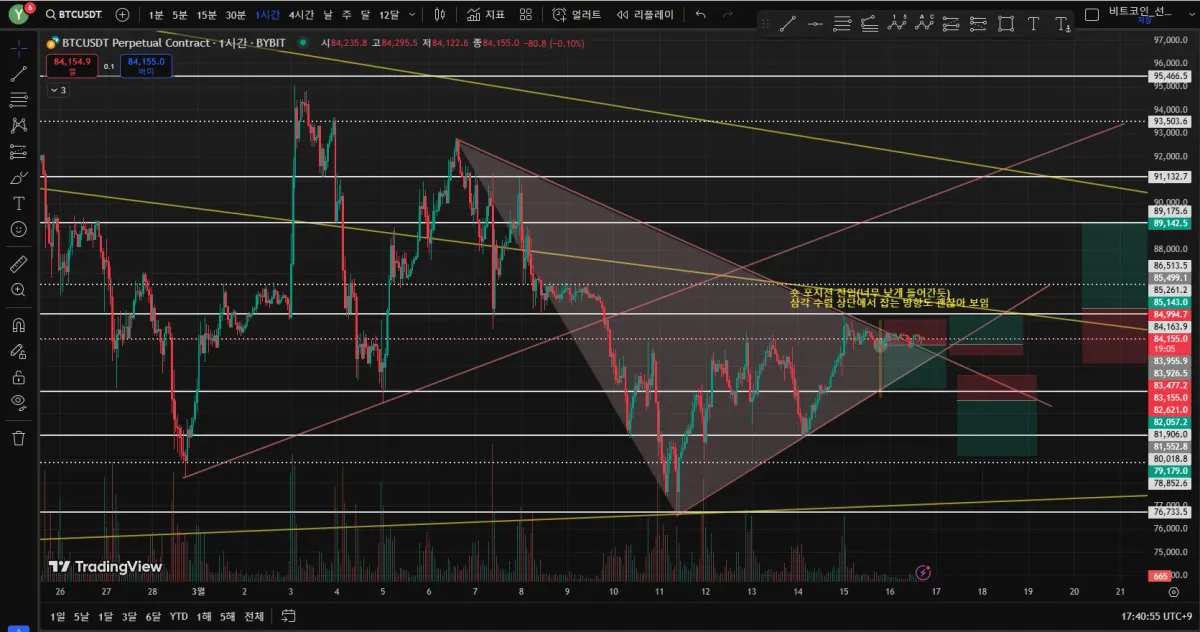 1) 어제 삼각수렴 상단 위치의 83,900부근에서 숏 포지션 진입(수수료 고려하여 지정가 설정)