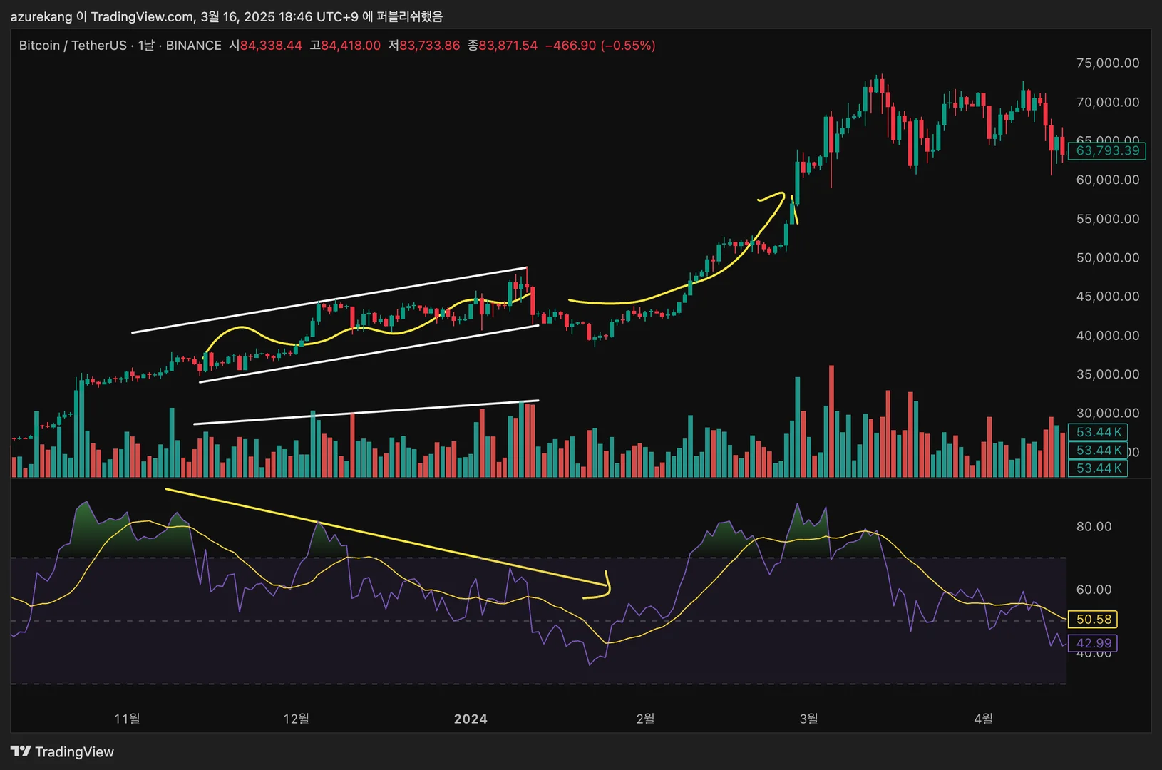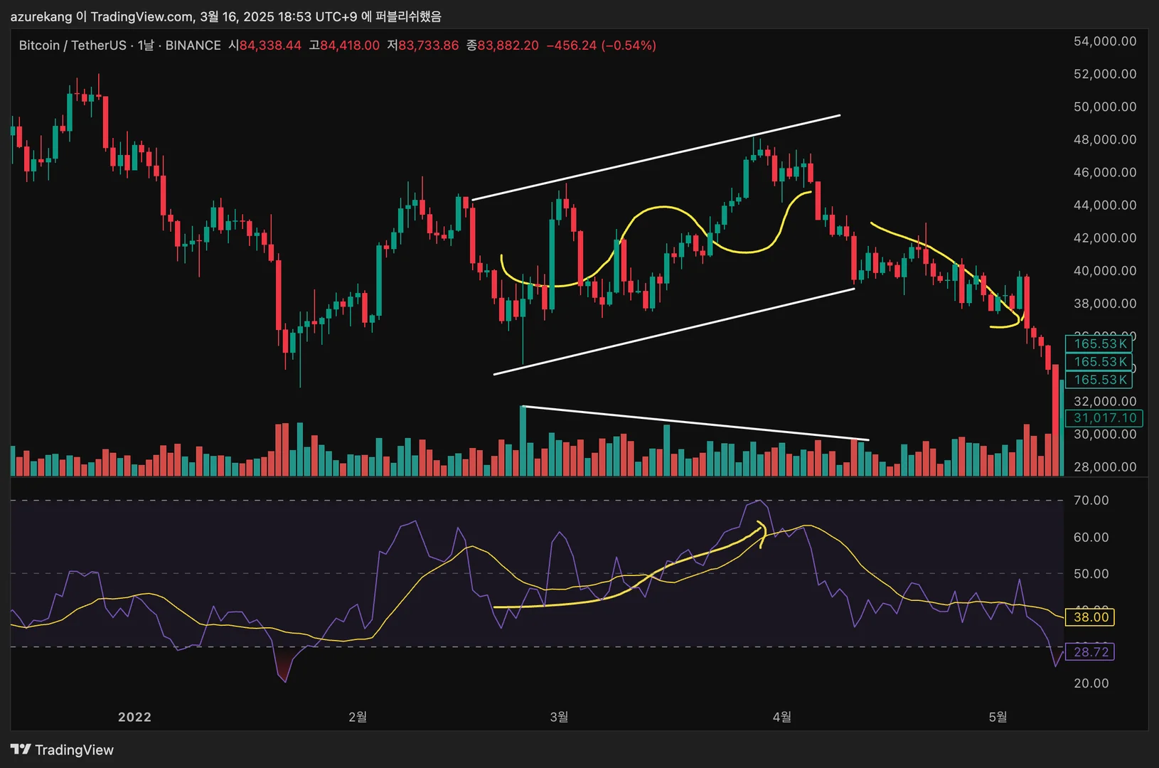 RSI 및 1일봉 기준으로 하락 다이버전스, 상승 다이버전스도 찾아봤습니다.