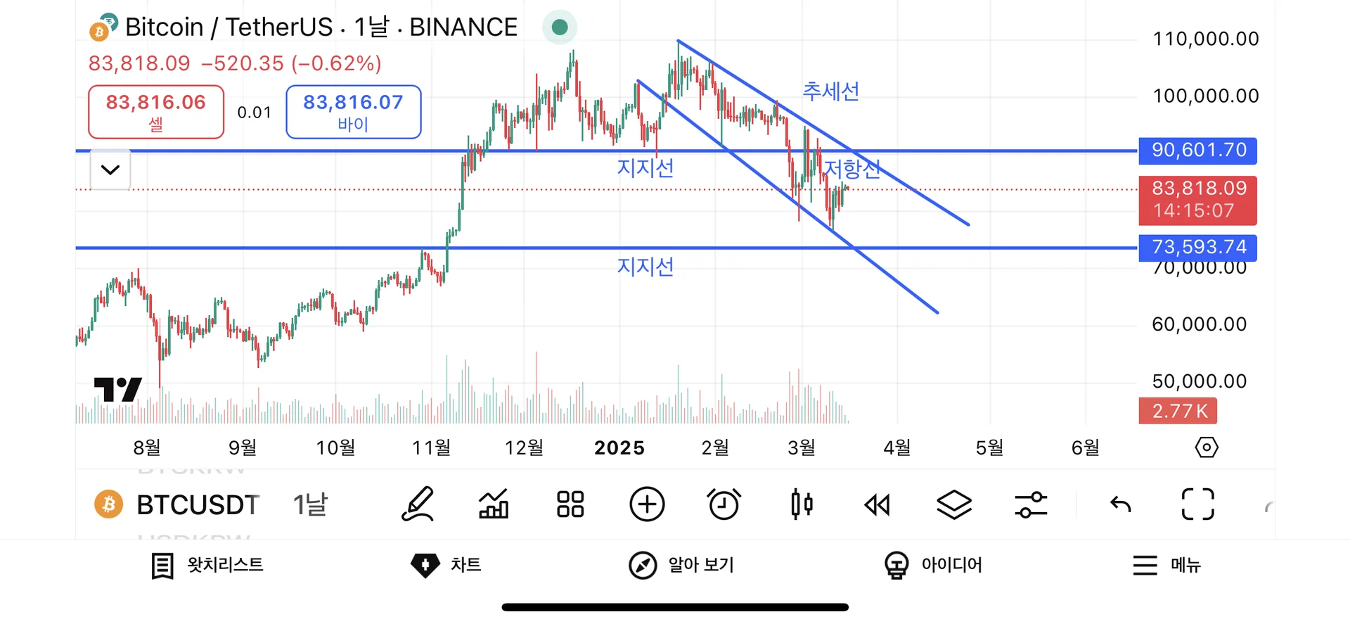 상승 추세로 이어지다 1차 지지선으로 그려놓은 지점에서 쌍봉 패턴이 보이며, 하락 추세를 볼 수 있습니다. 저항선을 뚫지 못한 모습을 보아 저는 2차 지지선에서 타점을 잡으면 좋을 것 같다고 생각합니다