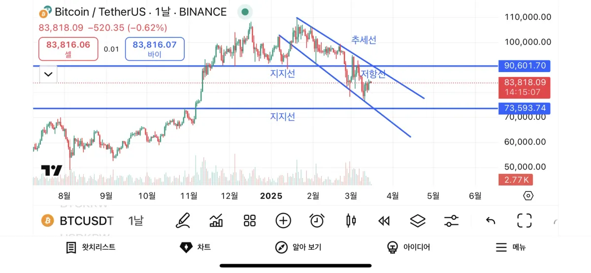 상승 추세로 이어지다 1차 지지선으로 그려놓은 지점에서 쌍봉 패턴이 보이며, 하락 추세를 볼 수 있습니다. 저항선을 뚫지 못한 모습을 보아 저는 2차 지지선에서 타점을 잡으면 좋을 것 같다고 생각합니다