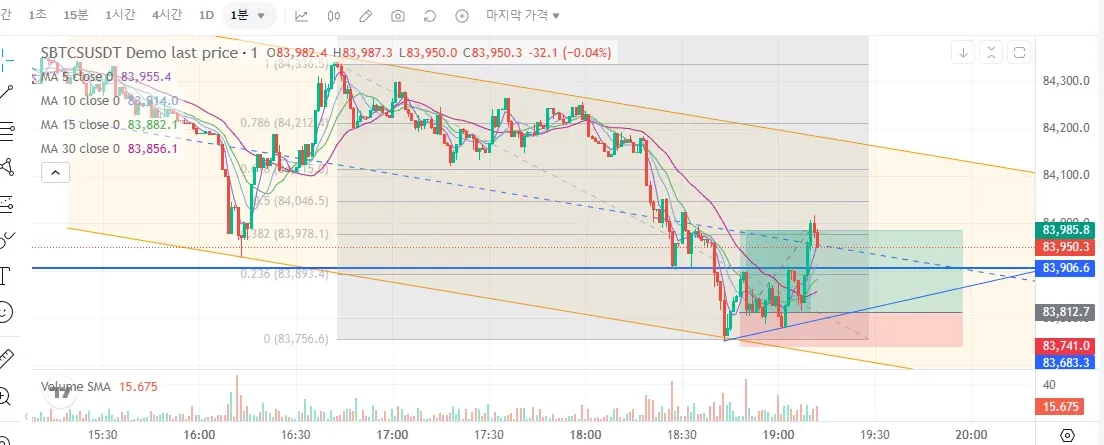 이전에 들었던 채널 매매법을 토대로 1분봉상 채널 하단에서 한번 올려줄거라고 보고 채널 중앙까지 짧게 보는 포지션을 잡았습니다 채널의 제일 고점과 저점의 피보나치의 0.236구간에 15분봉의 지지저항선과 거의 물려서 조금 더 길게 가져간다면 0.236구간에서 절반 털고 스탑로스를 본절까지 올린 후 채널상단까지 보면 어땠을까라는 생각도 드네요..