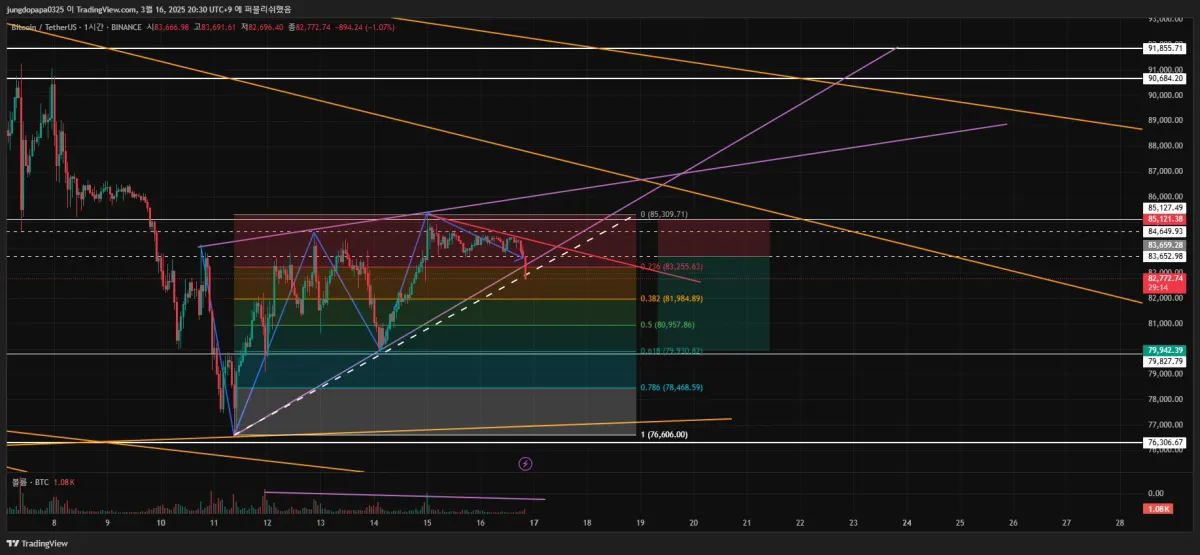 상승 쐐기형 패턴으로 보이고 1시간 분봉 지지선을 하방 돌파하는 시점으로 단기 하락이 예측되어 숏포지션 진입하였습니다.