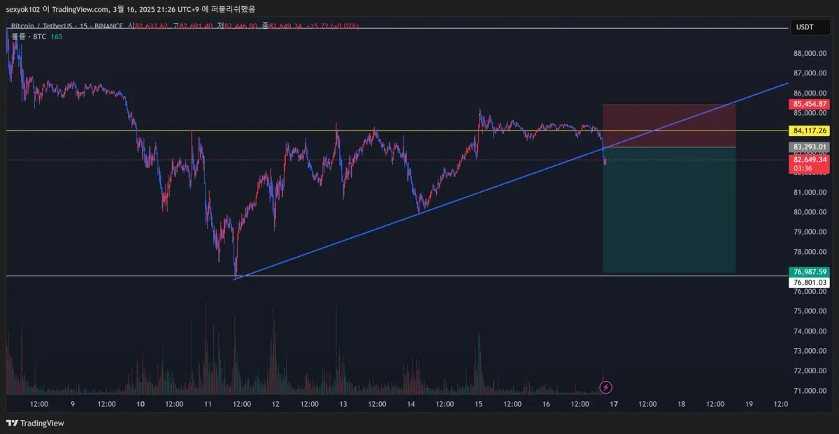 4시간 - 1시간 지지 저항 확인후 15분봉으로 삼각수렴 발견