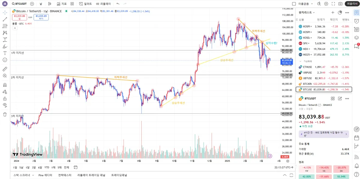가능한 많은 곳에서 추세선을 그려보려 노력했고 유의미한 변화가 있는 곳과 박스권이 형성된다고 판단한 곳에 지지선을 그려보려 노력했습니다.