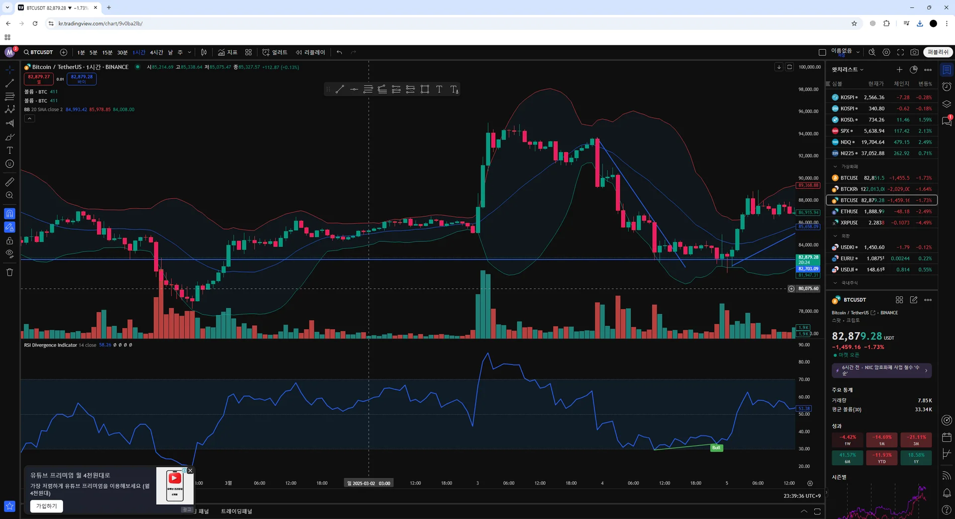 보조지표이며 주가의 고점 및 저점 포착에 자주 사용한다. 70 이상이면 과매수 국면이고 30 이하면 과매도 국면이다. 주로 가격과 RSI를 이용해서 다이버전스를 파악해서 가격이 어떻게 움직일지 예측하도록 도와준다.(거래량까지 동반하면 정확도 상승)