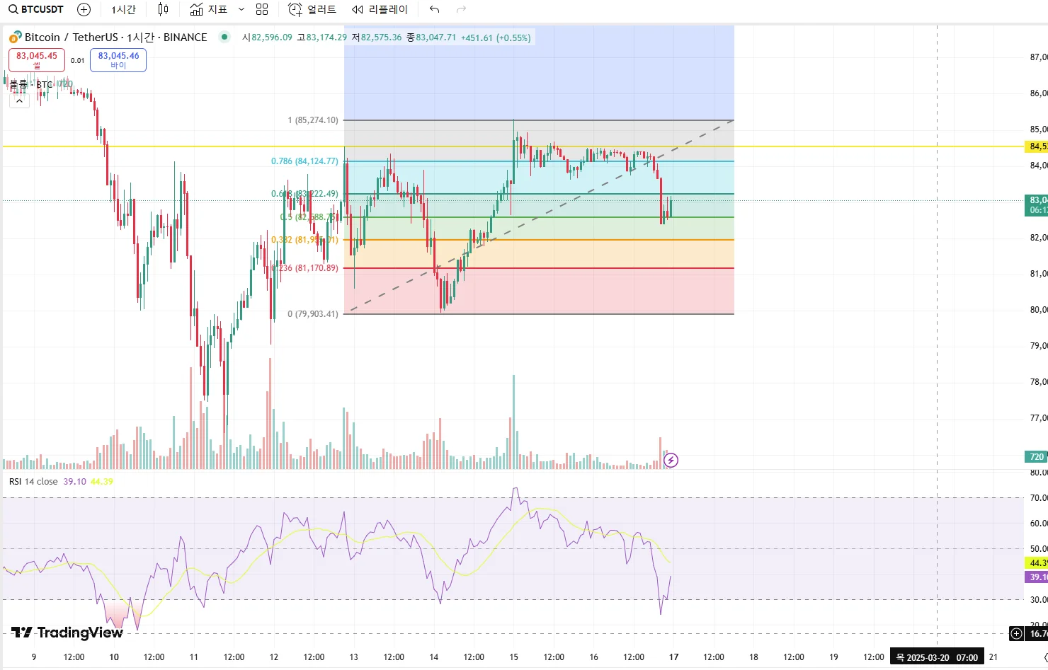84,500을 뚫었을 때 long으로 진입하였으나, 과매수 구간이었고 그 이후 하락하여 약간의 손실을 보고 나온 상태입니다.
